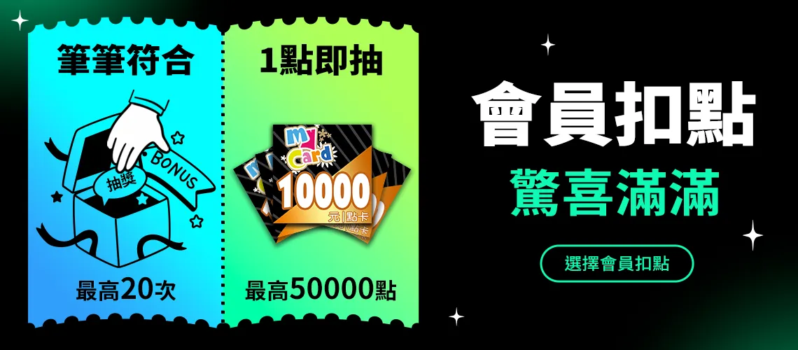 活動內容:活動期間,選擇「自動儲值、信用卡、銀行轉帳、電子/行動支付、電子錢包、FPX、八達通」付費類別中任一付費方式,單筆購買會員點數100點(TWD)以上,即可獲得MyCard會員點數10點、100點或1000點回饋,數量有限,領完為止。