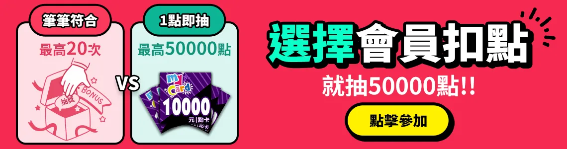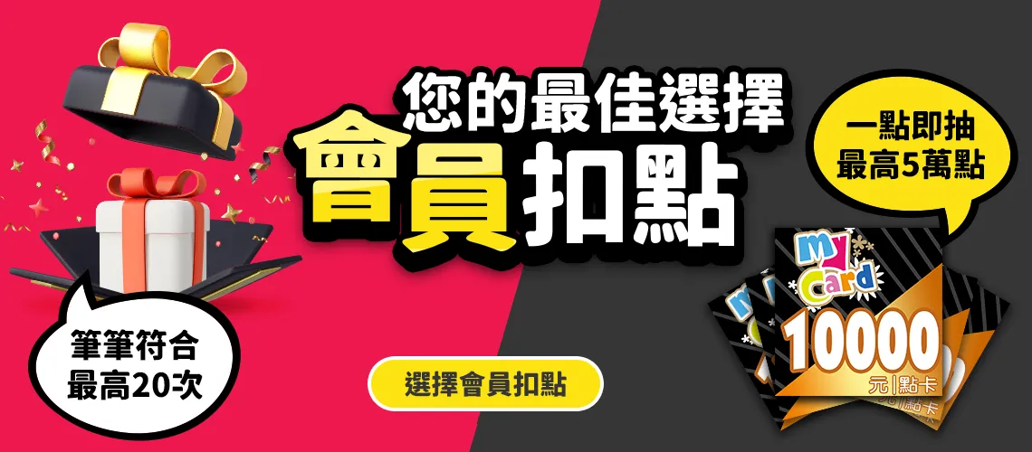 活動內容:活動期間,於遊戲、平台、數位內容服務網頁儲值/APK儲值/MyCard官網儲值入口,使用「MyCard會員扣點 」付費方式,單筆購買指定面額點數,即有機會獲得最高50000點、iPhone 17 Pro Max、iPhone 17、AirPods Pro 3、Apple Watch Series 11、Marshall 藍牙喇叭、Razer 電競滑鼠、Roborock 掃拖機器人、ROG 無線鍵盤等豐富大獎等你帶回家,數量有限領完為止!