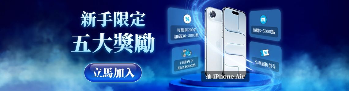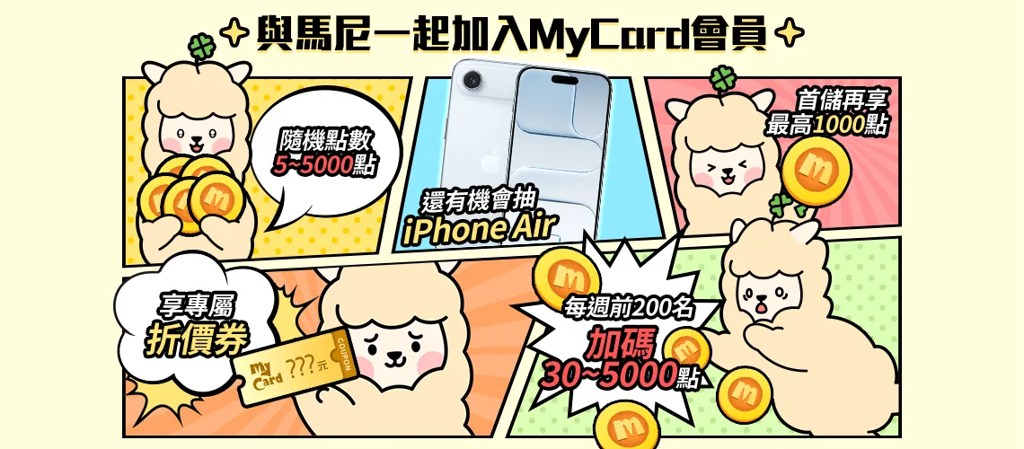 活動內容:活動期間,註冊成為MyCard會員並完成e-mail、手機驗證之會員即可獲得MyCard隨機點數5~5000點,每週前200名可保證領取MyCard隨機點數30~5000點(週五00:00重置)。每五天還享有一次抽iPhone Air機會,越早註冊抽獎次數越多!