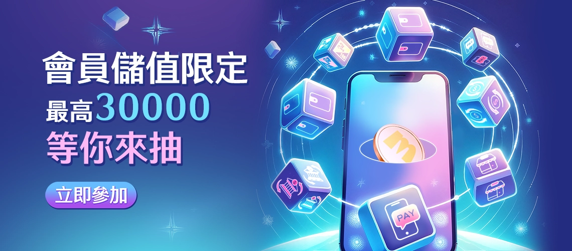 活動內容:活動期間,使用自動儲值、銀行轉帳、信用卡/金融卡、行動支付/電子錢包、實體商店繳費或點數卡,單筆購買指定面額點數成功儲值至MyCard會員帳號,即有機會獲得MyCard會員點數最高30000點、現金抵用券、iPhone 17 Pro Max、Marshall 藍牙喇叭、Razer 電競滑鼠、iPhone 17、Roborock 掃拖機器人、AirPods Pro 3、ROG 無線鍵盤或Apple Watch Series 11。